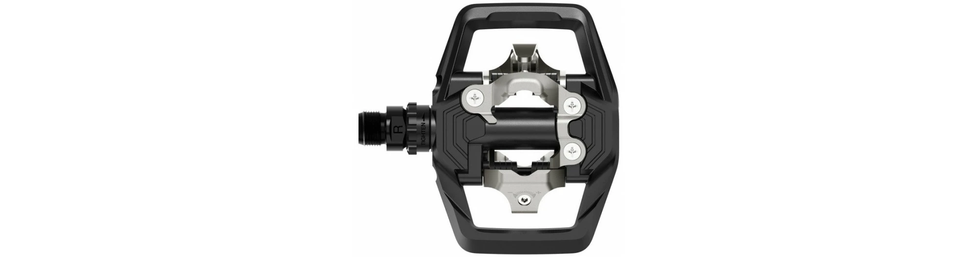 Fixation SPD doule-face qui améliore la stabilité pédale-chaussure et le transfert de puissanceLa cage intégrée augmente la stabilité et la maîtrise lorsque la chaussure n’est pas clipsée et permet une protection du mécanisme de fixation contre les chocs